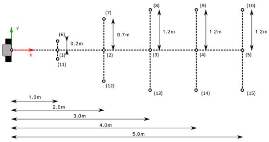The grid arrangement of the target object locations for testing. Numbers in parentheses denote the location identifiers. Kinect cameras and the laser scanner are located at the origin of the coordinate system. The Kinect cameras are in the same orientation for every target location, such that the optical axis of either camera is always aligned with the x-axis.