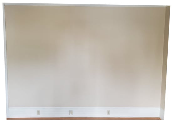 A room containing a 3.45 × 2.24 m (11.3 × 7.3 ft) blank, flat wall was used to assess vertical and horizontal variations in accuracy between Kinect devices (Figure 4). The wall was separated from the floor by a trim 23 cm in height. Trim also lined the left and upper portions of the wall as well, and the right boundary was determined by its corner with a perpendicular wall.