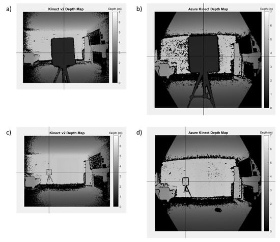 A pixel is manually selected for comparison by graphical input using MATLAB near the center of the board (Figure 6). If a zero value is returned, then there is a lack of depth data for the given pixel. Invalid pixels are ignored in the computation. We found that the center of the board is relatively immune to missing (zero) depth values compared to other areas of the image, such as the corners of the depth maps from the Kinect v2, which lack a mask as compared to the Azure Kinect. The mean and standard deviation of the depth distribution across 1000 consecutive frames for the selected pixel is then calculated to obtain the random depth error at each target location. Note that the positions of the Kinect cameras and the laser scanner were fixed during the acquisition process. At each of the five Z-depth values, we therefore obtained one sample that was close to the optical center and two samples that were offset horizontally to the left and right.