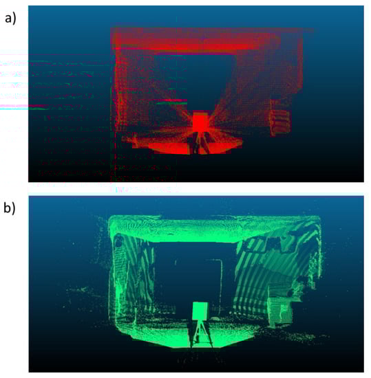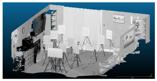The benchmark data for the accuracy evaluation were obtained using the X330 HDR FARO 3D Laser Scanner (FARO Technologies, Inc., Lake Mary, FL, USA). To capture point data, the laser scanner sends an infrared laser beam into the center of its rotating mirror. The mirror deflects the laser beam around the environment being scanned, while the scattered light is reflected back to the scanner. By measuring the phase shift of the light waves and the current angles of the mirror with respect to the sensor, the 3D coordinates of each point are computed with high accuracy. The single point measurements are repeated up to 976,000 times per second [17]. The range of FARO X330 HDR laser scanner is 0.6 to 330 m, with widest fields of view of 0 to 360° and −60 to 90° in the horizontal and vertical directions, respectively. For this data collection, the capture in the horizontal direction was limited to a range of 0 to 180° and in the vertical direction of −62.5 to 90°. The scan profile used was set to “Indoor … 10 m” (0.6 to 10 m range) with the following parameters: quality 3x, resolution 5.6 million points, scan size 2560 × 2170 points. Under these settings, the scan time was approximately 3 min 33 s. All our measurements were performed indoors at the range below 10 m.