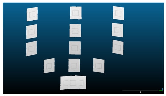 To register each Kinect-generated cloud to the FARO cloud, a distance-preserving transformation was applied that roughly placed the scans in place. Then, the Fine Registration (ICP) procedure was used in CloudCompare on board location 1 (the closest central point of the grid arrangement as shown in Figure 3), which was assumed to be the most accurate location. The corresponding transformation was copied and applied to each individual board within each Kinect dataset, so as to rigidly transform the Kinect point clouds as a whole onto the FARO cloud coordinate space (Figure 10).