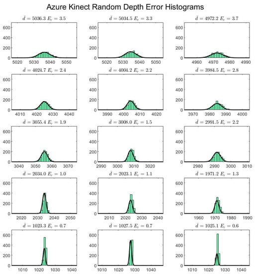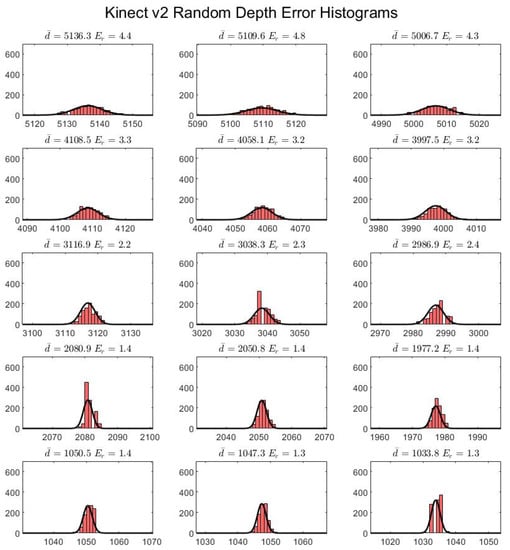 Random depth error for the Kinect v2, where indicates the average depth value and is the standard deviation, or the random depth error. The horizontal axes and titles are in units of millimeters, while the vertical axes indicate bin counts. Each bin is 1 mm in width.