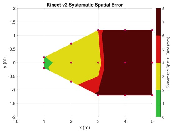 In addition, the non-linear mapping from radial and tangential distortions also contributes to the error in and through any errors in the distortion coefficients [20]. The computation is too unwieldy to describe here. However, one can expect the contribution to the overall error to increase significantly toward the boundaries of the image where distortion may be higher (see Figure 6). We conclude that the systematic spatial error is highly dependent on the quality of the intrinsics obtained from camera calibration. In our assessment, we do not specifically calibrate the Kinect system but rather use the calibration values encoded into each camera unit that are accessible via their respective Software Development Kit (SDK).