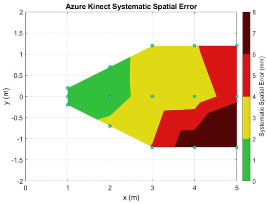 The systematic spatial errors and their standard deviations are logged into Table 2. Using this data, a contour plot over the horizontal plane was generated from the key locations to visualize the error distribution across the range for both the Kinect v2 (Figure 13) and the Azure Kinect (Figure 14). To generate these plots, a mesh grid was created using Delaunay triangulation. The data were then linearly interpolated using MATLAB’s griddata function and displayed as a surface plot.