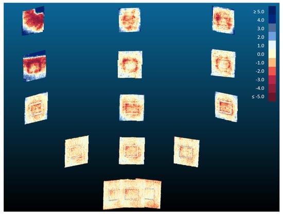 By fitting a plane to the Kinect v2 and Azure Kinect averaged point clouds, we were also able to investigate the planarity of the data. Using a signed distance metric, a color map of distances to the plane of best fit was generated for each board location (Figure 15 and Figure 16). The color scale is set to display the range of distance errors with colors saturating to dark red at −5 mm and to dark blue at 5 mm. Yellow colors are associated with points laying on the plane of best fit. A negative value (reddish colors) indicates a point in front of the plane, while a positive value (bluish colors) indicates a point behind the plane.