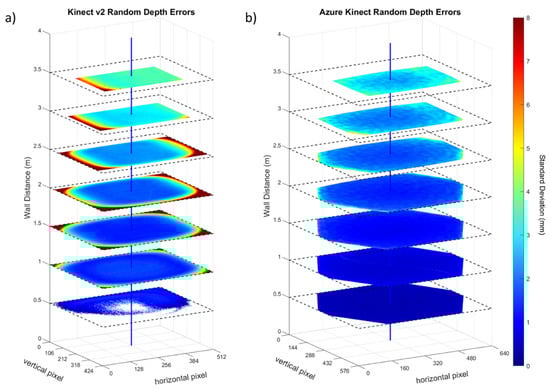 Distribution of the random depth error (mm) at varying distances to a flat wall for the (a) Kinect v2 and (b) Azure Kinect. The observed flat area was cropped at larger distances to retain the same portion of the scene in all views.