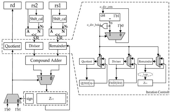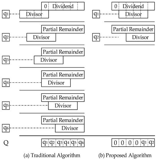 In the proposed algorithm, during initialization, the most effective bits of the divisor and the dividend are aligned. The most effective bit of one data point is the most significant bit in which the digit is 1. Therefore, the quotient digit generated in the first iteration process is effective, eliminating the previous invalid iteration process and improving the efficiency of division execution. As shown in the right panel (b) of Figure 2, the most effective bits of the divisor and the dividend are normalized and aligned, and a total of two iterations are performed. In this example, the proposed algorithm saves 66.7% of the iteration cycles. For division operations in processors, the operand bit width is 32 bits. Traditional algorithms, such as the restoring, non-restoring, and Radix-2 SRT algorithms, require a fixed number of 32 iteration cycles, whereas the proposed algorithm dynamically adjusts the number of cycles from 2 to 31 according to the effective bit width of the operands, which can save more iteration cycles.