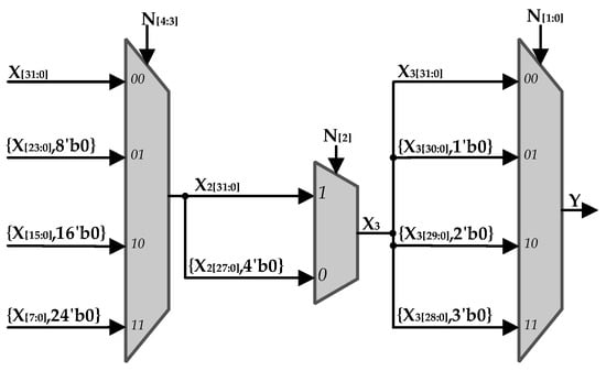 - Shift: Figure 5 shows the structure of the shift module. According to the value of N, the input data X is shifted left by the corresponding number of bits. The weight of N[4:3] is 8, so when N[4:3] is 0, 1, 2, 3, X is shifted left by 0 bits, 8 bits, 16 bits, and 24 bits correspondingly. N[2] has a weight of 4 and N[1:0] has a weight of 1.