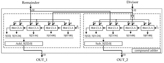 - Compound Adder: Figure 6 shows the architecture of the compound adder, which execute remainder plus divisor and remainder minus divisor simultaneously. It consists of two adders, each of which consists of four 8-bit sub-Carry Lookahead Adders (CLAs). The left adder calculates the result of remainder plus divisor. Remainder and divisor are spilt into four 8-bit wide sections. Every sub-CLA computes the addition result of the corresponding parts of remainder and divisor. The carry digit of the first sub-CLA is 0, and other sub-CLA’s carry digit comes from its last level sub-CLA. The right adder in Figure 6 calculates remainder minus divisor. The difference from the left is that remainder plus the complement of divisor and the carry digit of the first sub-CLA is 1. Therefore, the subtraction is converted to the addition of a two’s complement.