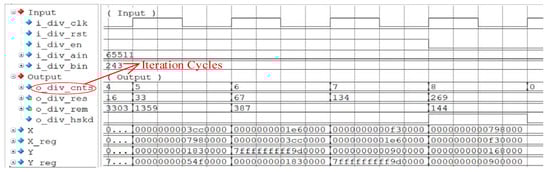 Figure 7 shows the function simulation result of the divider design using Modelsim. The dividend i_div_ain and the divisor i_div_bin are random numbers, 65,511 and 243 respectively, and the number of iteration cycles is 9. X and Y are the results of intermediate iterative operations. The counter o_div_cnts starts counting from 0. When o_div_cnts is 8, the division completion signal o_div_hskd is valid, and the final iterative results are obtained: the quotient is 269 and the remainder is 144. If the traditional non-restoring algorithm is used, the number of iteration cycles is 32. This example saves 71.8% of iteration cycles.