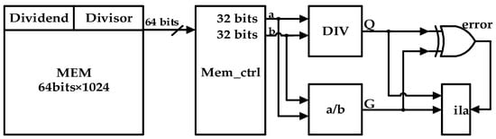 The 32-bit dividends and divisors are stored in the storage module MEM, and these data are 32-bit random data generated by Matlab. Through the storage control module Mem_ctrl, a pair of dividend a and divisor b are read each time and passed to the subsequent operation units. The DIV module is the divider module designed in this paper, and its calculation result is the quotient Q. The a/b module is the Vivado division ip core, and its division operation obtains the standard result G. XOR is performed on the results of the two operation modules to obtain the error signal. If Q and G are different, the signal error is 1, otherwise there is no error and the signal error is always 0. During the running process, the resulting waveform is captured through the Vivado ip core ila.