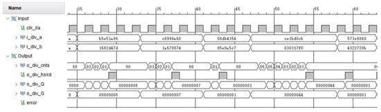 As shown in Figure 9, the operation result of the divider module DIV is o_div_Q, and the standard result obtained by the Vivado division ip core is o_div_G. According to different input data, the number of iteration cycles o_div_cnts changes dynamically. When each division operation of DIV is completed, that is, when o_div_hskd is 1, the results of both are compared; the error signal is always 0, and the operation result of the DIV module is correct.