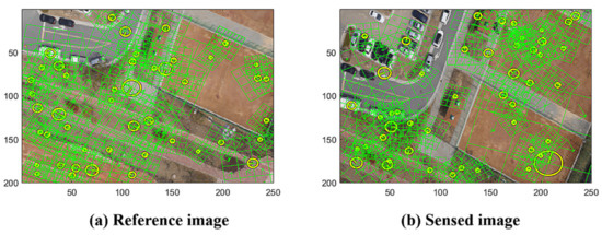 The general approach for stitching images involves identifying key points and comparing their local descriptors to determine the transform of the key points’ geometric correspondence to generate the resampling rule of the sensed images [1,2]. In our study, we use SIFT as the descriptor, which is applied in many studies for its well-known geometric invariance properties [26,28]. Figure 1 shows the reference image and sensed image with the marks of the SIFT points, where the images are resized into a 200 250 resolution; we present 50 random SIFT points and the lattices of the orientations.