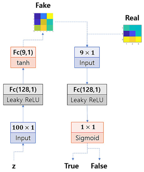 Now, to train the GAN, we model the architecture of the networks’ layers with a multi-layered perceptron so that we could efficiently use small-sized input data to train the networks. We set one hidden layer for the discriminator and one hidden layer for the generator. Figure 5 illustrates the structure of the GAN. The hidden units are set by 128 units and activated by a leaky rectified linear unit (Leaky ReLU), the output units of the generator are activated by the hyperbolic tangent function (tanh), and the output unit of the discriminator is activated by the logistic sigmoid function.
