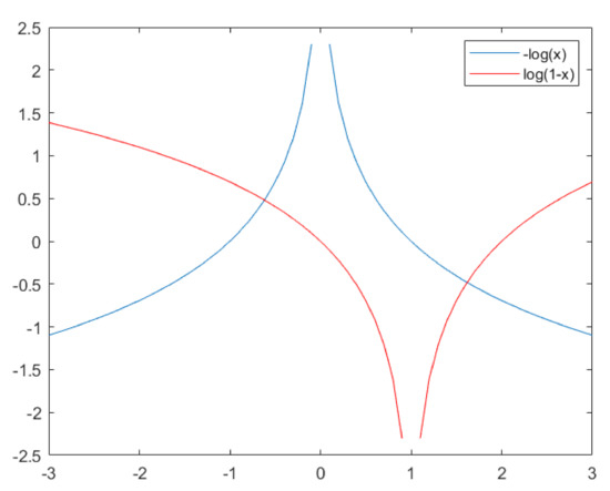 In our study, we aim to generate samples similar to the outliers of the transform to allow the discriminator to experience the differentiation of outlier-like samples, and we suggest that, if the generator produces samples similar to real samples, then the discriminator will suffer in learning knowledge about the outliers. To this end, we apply a loss function to train the generator with lower slopes of the gradient than those used in Equation (5) and, as one of several choices, we use instead of ; looking at Figure 6, which presents the comparison plots for and , as the value approaches 1, the slope of the gradient in becomes steeper than , and we suppose that, if we set the generator’s loss function to , then the discriminator’s response to determine the differentiation is more sensitive than the generator’s sensitiveness to shape the fakes, which will give the discriminator more chances to learn lots of information about the outlier-like samples. Note that if appears near to be 0, it is not necessary to have the discriminator speed up to discern the fakes, because the input is the fake. From that suggestion, in training the generator in our study, we solve the minimization problem: