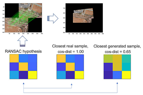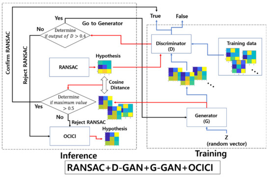 For example, we apply deep learning to verify RANSAC, a method widely used to find the true inlier of the mapping function, and we improve its performance by linking it with other a posteriori outlier rejection methods, such as optimal choice of initial correspondence inliers (OCICI) [4,26]. In the process of determining the hypothesis found through RANSAC, its authenticity is determined by training a generative adversarial network (GAN) [27]. After training various types of existing affine maps delivered by RANSAC, we first make the discriminator of the GAN determine the authenticity, after which we compare it with the affine map generated by the generator to make a final decision.