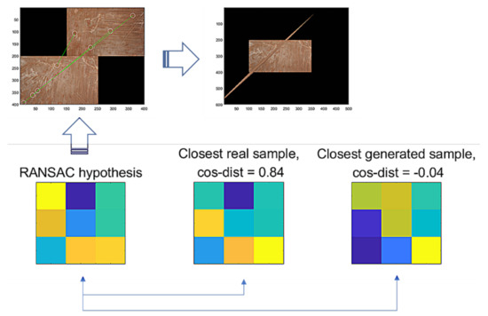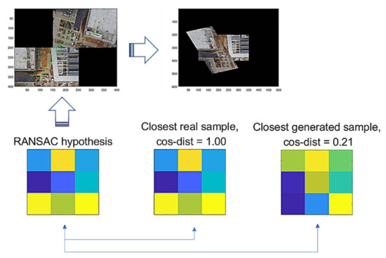 Figure 9 illustrates the comparison of a hypothesis given by RANSAC, the closest real sample, and the closest generated sample by G-GAN, where the cosine distance from the hypothesis = 0.65 (D-GAN’s output = 1). In this case, we know that the hypothesis is good and that the real one achieves the best match. Even though the generated one has a relatively far distance, we can employ a threshold to discern the hypothesis’ validity; i.e., for a given hypothesis and the closest generated sample , if it holds that