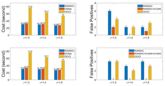 Table 4 presents the comparison results for the calculation cost and accuracy for the datasets set by , which have been obtained using RANSAC, ODNet, and OCICI. Looking at Table 4, for , ODNet and OCICI produce 100% accuracy; note that the maximum value in the parentheses indicates the accuracy accomplished by ODNet if the rejected RANSAC’s correction method is replaced by an ideal one instead of OCICI; in total, we see that ODNet outperforms the others in terms of accuracy and reduces the cost consumed for the OCICI scheme. In Table 5, we give the false positive cases (FPs) versus whole pairings and the false negative cases (FNs) among the negatively discriminated ones by D-GAN, and the true negative detection (TND) that denotes the cases in which the D-GAN accurately discriminates the RANSAC’s falsely estimated cases.