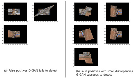 Figure 17 presents (a) the types of the stitching outputs mapped by the sample transforms that were used as the GAN’s training data, and (b) a miscellaneous stitching output that is not included in the output types for GAN’s training data, where we set the threshold to be . For this example, the G-GAN outputs 0.56 for the hypothesis’s distance, and if we set the threshold , then it shall be discerned as a true one. Table 8 lists the results of an experiment that we have conducted to rigorously verify the robustness of the proposed methods in many severe conditions. For the test, we have performed 20 hypothesis trials using RANSAC, which has been constrained to operate for only three epochs for inference, which we have implemented to increase the probability of FPs to appear, where the thresholds and are set as 0.4 and 0.5 for D-GAN and G-GAN, respectively. In this case, the G-GAN also outperforms D-GAN in discerning outliers, even though the G-GAN has made one misdetection among the 40 trials in total. For the case in which G-GAN was mistaken, we suggest that the situation may happen in which the given images’ correct mapping is out of the types of the forms that the images employed in the training dataset have; i.e., the generated sample of G-GAN is unfamiliar for the network of G-GAN itself. For this issue, we may have to consider better training strategies to overcome the networks’ suffering for the unfamiliar styles of the test samples and enhance the performances of the proposed models to operate in severe conditions that affect the descriptors.