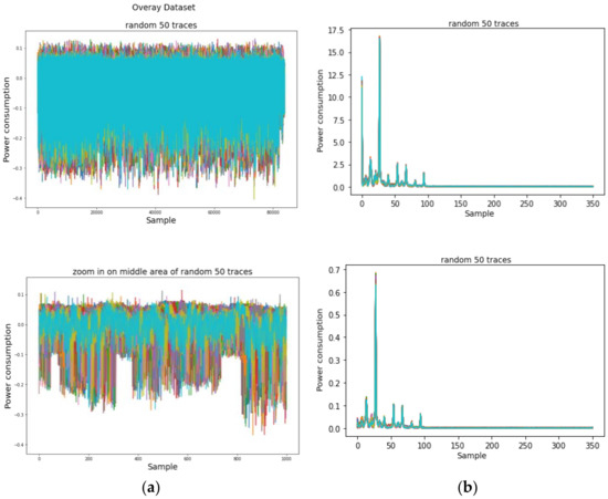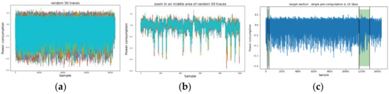 We first investigated the power traces of AES-M-sync, as shown in Figure 1, and then selected the target time intervals, as shown in Figure 1c. We then transformed the concatenation of the two time intervals for each trace by TFA and TFAwPS, as shown in Figure 2a,b.