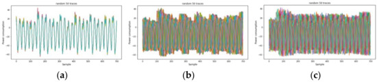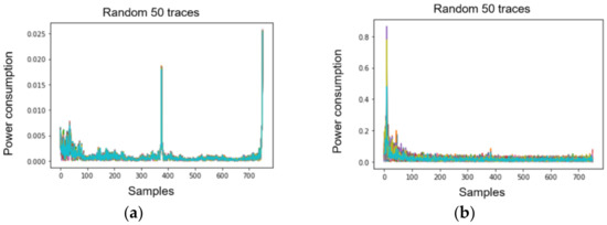 ASCAD is a well-known public dataset in the SCA domain for the reproducible study of profiling SCA, and it includes a set of electromagnetic (EM) traces obtained by measuring the emissions using an 8-bit MCU (ATMEGA8515), where a first-order masked AES operates [43]. The target of leakage is the 3rd SubByte in the 1st round of AES. ASCAD has three kinds of trace cases: ASCAD-sync, ASCAD-desync50, and ASCAD-desync100, as shown in Figure 11. The original traces are well aligned and are used as an ASCAD-sync case.