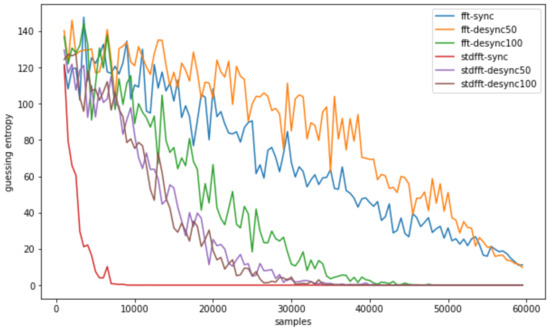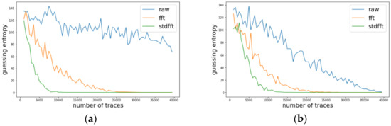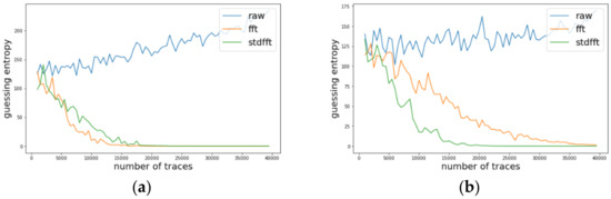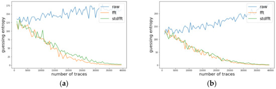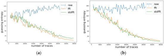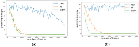 Likewise, we investigated the change of guessing entropy per varying the number of traces in three cases investigating a basic CPA with raw traces, TFA, and TFAwPS. Figure 6a,b presents the best cases for TFA and TFAwPS, respectively, while Figure 7a,b presents the worst cases for TFA and TFAwPS, respectively. In the best case, TFAwPS has a better output than TFA and in the other cases, even the worst case, TFAwPS shows a similar performance against AES-M-desync50. Table 2 presents that TFAwPS found one more key than TFA did.
