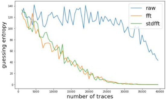 We investigated the change of guessing entropy per varying the number of traces on three cases using a basic CPA with raw traces, TFA, and TFAwPS. Figure 9 present the best cases for TFA and TFAwPS, while Figure 10a,b presents the worst cases for TFA and TFAwPS, respectively. From the best and worst results, we recognize that TFA and TFAwPS achieve similar performances. Due to the use of fixed time intervals and severe random delay, TFA and TFAwPS succeeded at finding only four keys (See Table 3).