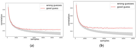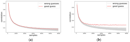 where variable represents a set of real power consumption values, is a set of predicted Hamming weight values, is the covariance of and , and is the variance of . If the key guess is correct, then the hypothesis is calculated correctly, and the correlation coefficient is higher than other cases on incorrect key guesses.