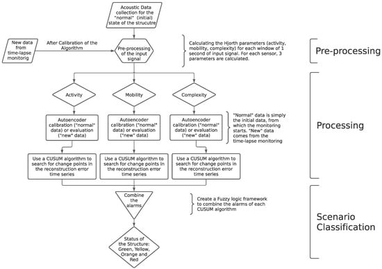 Each Hjorth parameter obtained for every sensor was used to calibrate an autoenconder. Then, the reconstruction error of each autoencoder was used to monitor how far from the original (normal) state the acoustic signature of the scale dam was. The time series of reconstruction errors were combined with a cumulative sum (CUSUM) algorithm, which indicated changes in the sequential data collected. To combine the output of the CUSUM algorithm for the three autoencoders, a fuzzy logic framework was used to predict the status of the structure.