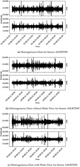 Regarding the application of autoencoders to dam monitoring, Chen et al. [] used a time-series denoising autoencoder (TSDA) to represent the spatial and temporal features of the nodes by compressing high-dimensional monitoring data. Then, those authors used a network partitioning algorithm (NPA) based on spatial–temporal features obtained by the TSDA to monitor the dam itself. Therefore, autoencoders were not directly used to track the changes in the input signals, but to reduce its dimensionality and clean it.