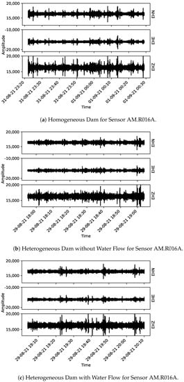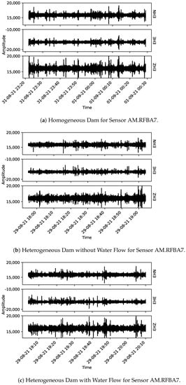 Collected data for sensor AM.RFBA7. From (a–c) the three monitoring stages are presented: homogeneous dam, heterogeneous dam without flow and heterogeneous dam with flow, respectively.