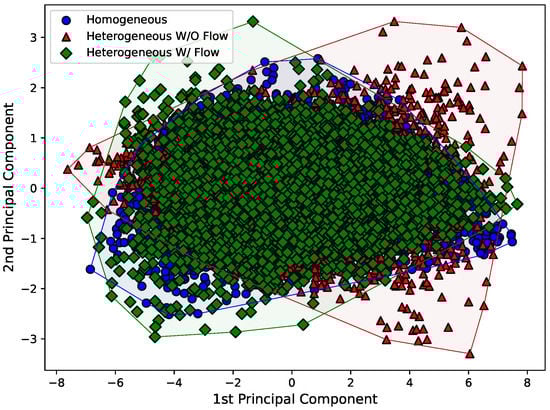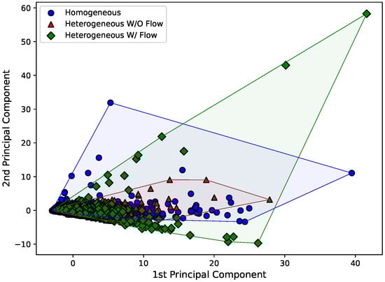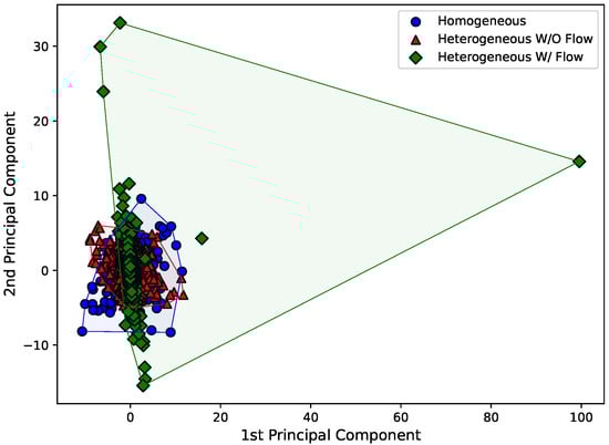 Therefore, Figure 8, Figure 9 and Figure 10 present the first and second principal components of the eight-dimensional dataset for each Hjorth parameter, obtained by using sklearn’s implementation named “PCA”. The datasets were also separated according to the experimental arrangement of the dam. To make the visualization of the spreading of the points easier, a convex hull (the smallest convex set that contains the points []) was drawn using scipy’s implementation of the “ConvexHull” class.