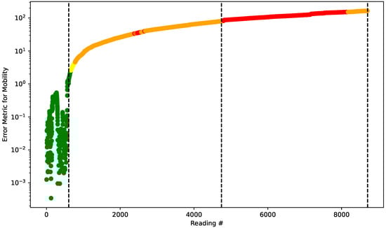 Thus, it is possible to plot the classified values over time. For simplicity, in Figure 11 is plotted the evolution of the error metric for mobility and the color of the dot will reflect the class it belongs to.