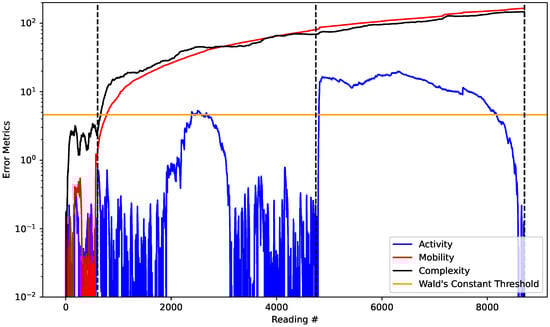 The algorithm was able to quickly detect the changes between dam integrity scenarios, which shows the suitability of the methodological proposal. It is also important to study the contribution of each of the reconstruction error series to the final result of the system state classification. Thus, consider Figure 12, which plots the metrics for the error evolution of each Hjorth parameter as well as the Wald’s constant threshold.