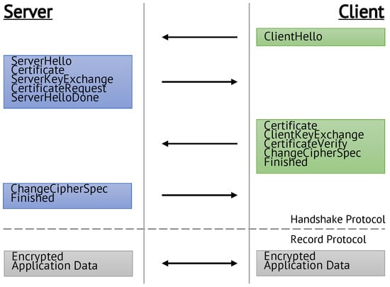 TLS is a cryptographic protocol that protects communications against eavesdropping, tampering and message forgery and is deployed in many areas, including Hypertext Transfer Protocol Secure (https) []. PKC is utilized to provide authentication and to solve the secret-key distribution problem by an initial establishment of a master secret. This master secret is subsequently used to create the keys to encrypt the application data with symmetric cryptography, including message authentication codes (MACs) to ensure integrity.