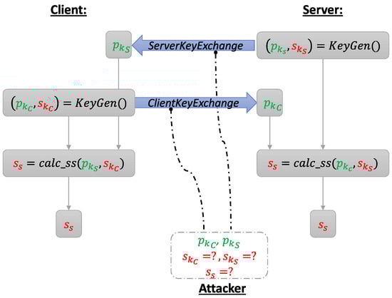 In this setup, a DSA is used to prove the authenticity of each communication partner and to protect the communication against MITM attacks, while a key-establishment algorithm builds the pre-master secret. The procedure for an Elliptic Curve Diffie–Hellman Ephemeral (ECDHE) key-exchange is displayed in Figure 2 from a top-level view. Both communication partners generate a pair of keys and exchange their public keys. Then, they use their own secret key and the opposing, received public key to calculate a shared secret, which results in the same value for server and client due to the mathematical properties of ECDHE. For an attacker, it would be sufficient to have access to either skC or skS to calculate the same shared secret and break the cryptosystem; however, refactoring skS from pkS requires solving the elliptic curve discrete logarithm problem, which is assumed to be intractable on conventional computers.