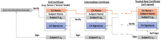The protocol in Figure 2 is still susceptible to an MITM, as it can intercept the KeyExchange messages and send their own public key to client and server. Therefore, servers and clients use DSAs along with additional pairs of long-term keys to prove their identity and prevent attackers from intercepting and tampering with their messages by creating verifiable digital signatures. In the TLS handshake, the server uses its secret key belonging to DSA to sign the public key belonging to ECDHE in the ServerKeyExchange message, while the client verifies this signature with the server’s public key, what had been previously transmitted in the Certificate message as part of the server certificate. In this message, the server’s certificate chain is transmitted to establish a chain of trust containing the server’s own certificate (and optionally several intermediate certificates depending on the PKI used) and a root certification authority (CA) certificate (Figure 3). The client then proves its identity to the server in the CertificateVerify message by calculating the hash value of all handshake messages sent so far and signing them with its DSA. Today, the most-used DSAs are Elliptic Curve Digital Signature Algorithm (ECDSA) and Rivest–Shamir–Adleman (RSA).