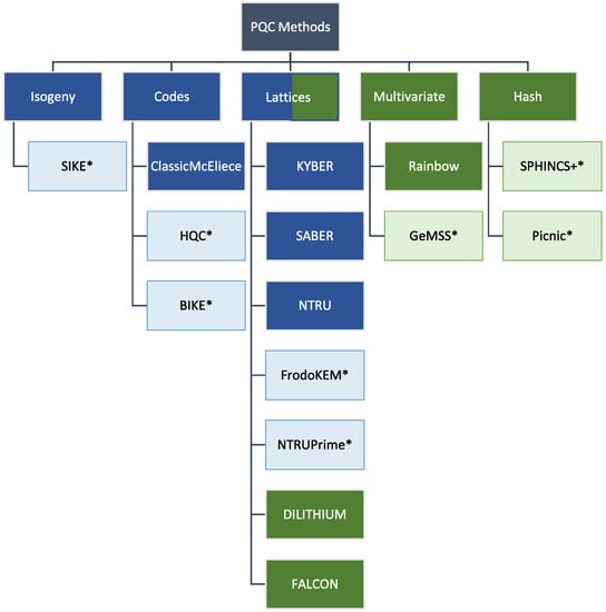PQC has emerged to find new, QC-resistant PKCs due to the vulnerabilities of state-of-the-art cryptography. These new PKCs are the subject of a US NIST-conducted standardization process, which is divided into multiple rounds []. The new algorithms are based on different mathematical problems than conventional PKCs and based on hard problems over lattices, codes, isogenies, multivariates or hash functions that are assumed to be resistant against QCs. Currently, the process is in the last round, and the remaining candidates were divided into “finalists” and “alternate candidates”, with one of the finalists for each threatened PKC (KEMs and DSAs) to be standardized in the near future, see Figure 4. Alternate candidates are intended as a backup in case new weaknesses of finalists are detected during the process and may also be standardized in the future.