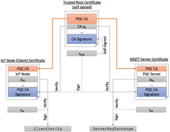 The open-source Eclipse Mosquitto is used as MQTT broker (https://github.com/eclipse/mosquitto, accessed on 24 February 2022) on the server, which provides an application programming interface (API) for the integration of OpenSSL. The TLS 1.2 version of the OQS project, OQS-OpenSSL (https://github.com/open-quantum-safe/openssl, accessed on 24 February 2022), was used to implement post-quantum security on the server. As support for TLS 1.2 was dropped by the project in 2020, we updated the library with the newest KEM versions. Furthermore, the library does not support post-quantum DSAs and certificates. Therefore, we implemented these features.