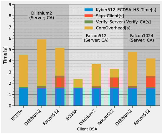 All measurements were carried out ten times on the client side for each algorithm-respective PKI. We recorded the TLS handshaking procedure, starting with sending the ClientHello message on the edge device and ending with receiving the Finished message from the server. The figures show the mean values of the measurements, and the standard deviation is shown in the graphs with error bars. The exact numerical values of the measurement results are shown in Table A1 and Table A2 in the Appendix A.