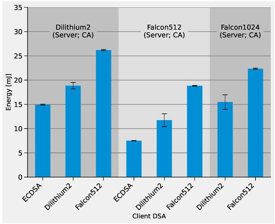 The US NIST plans to standardize only one out of these two algorithms []. Nonetheless, they have their individual benefits regarding security, bandwidth requirements and computational complexity of the sign and verify operations. Hence, we also deploy PKIs where the client authenticates itself by using Falcon and the server by using Dilithium and vice versa to determine the most energy- and latency-efficient solution for our IoT setup.