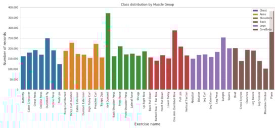 The 42 exercises covered in this study are listed in Table 1, and their instance count is depicted in Figure 1. The x-axis in Figure 1 lists the names of exercises based on muscle group, and exercise-wise instance count is presented on the y-axis. All of these exercises are well known and a selection of them are included in a typical workout. Some of these exercises are basic and are performed by all weight trainers, from beginner to advanced level. Others are usually included in the workouts of intermediate- and advanced-level practitioners of the sport.