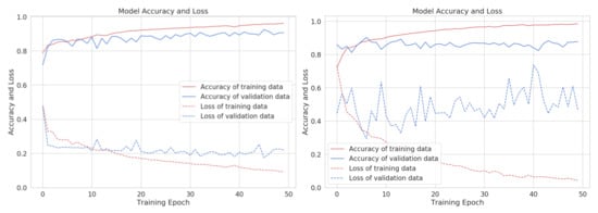 The training and testing evolution for the chest and back workout groups are shown in Figure 5, depicting epoch-wise accuracy and loss of training and validation data for both workout groups. The training and validation accuracy tends to increase and loss tends to decrease with each epoch.