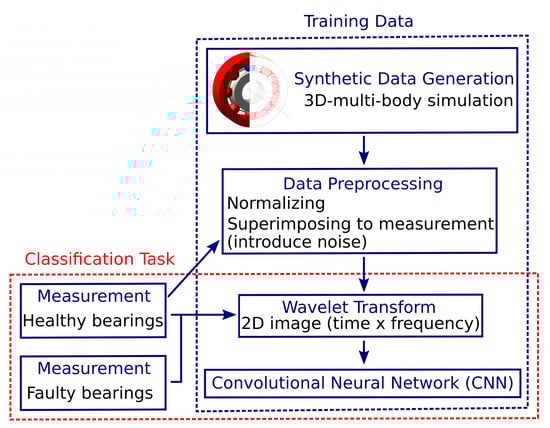 This work presents a simple 3D simulation model of a ball bearing under different conditions, that is, bearing faults in the form of holes at the inner and outer races. A simplified bearing model is a fast and flexible way to create generic training data and overcomes the issue of a ‘biased’ dataset compared to training data extracted only from measurements. In addition, multiple defective bearings are simulated with limited effort, thus enabling the creation of a ‘bearing condition database’. The data are further superimposed by background noise from measurement of a healthy bearing to facilitate the transfer to a more ‘realistic’ dataset. Next, wavelet transform is applied to create images comprising time and frequency information before a deep-learning CNN is trained on these data. The wavelet transform is used to overcome the limit of a fixed time-frequency resolution in comparison to STFT. To evaluate the CNN’s performance, measurements on real bearings with different health states are conducted and classified by the network. Further, an additional CNN was trained with pure measurement data, to compare performance and classification accuracy with simulated data. Figure 1 summarizes the proposed method.
