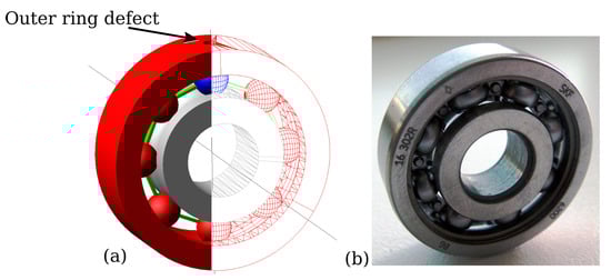 Synthetic bearing vibration data are created with the multibody dynamic modeling software MSCAdams [34]. The bearing components are simplified as rigid bodies and the contact force is numerically evaluated during impacts, which is based on the Hertzian contact theory and considering penalty regularizations. Coulomb friction is enabled and set as greasy steel-greasy steel interaction according to the MSCAdams’s material contact properties. Figure 2 depicts the 3D model and the original bearing. The bearing primary dimensions have been obtained from the manufacturer’s site (skf6200 [35]). However, since important dimensions such as the ball diameter, raceway groove and bearing clearances are not specified by the manufacturer, these parameters have been estimated as follows: the ball diameter is 4.76 mm; the inner and outer ring raceway groove curvature radii are 2.43 mm and 2.48 mm, respectively; the bearing internal clearances (radial play) are set to 20 m, which corresponds to ISO clearance class C3. To minimize the degree-of-freedom (DOF) and, hence, accelerate computational time, the rollers’ cage is replaced by rigid links to guarantee fixed spacing, but tolerate the rollers’ rotations in 3D space. Additionally, the engine’s intern geometry library RAPID [36,37] was selected, which is a polygon-based interference strategy for contact operations to expedite simulation.