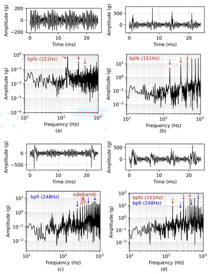 A few selected simulation results are briefly discussed in this subsection. In general, bearing fatigue yields distinctive fault frequencies, which are related to the bearing’s dimensions. These fundamental defect frequencies are summarized in Equations (1)–(4) as ball pass frequency outer race (), ball pass frequency inner race (), fundamental train frequency () and ball spin frequency () [38,39].