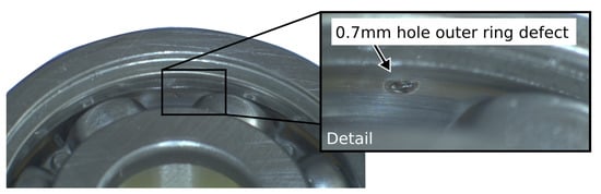 Ball bearings have a low starting friction and are mainly used where stop-and-go processes occur, such as in the automotive industry. Nevertheless, bearings experience fatigue, wear, corrosion and deformation enforced by operation in harsh conditions, misalignment, insufficient lubrication, contamination and so forth. In this work, the standard ball bearing skf6200 [35] is thoroughly studied as a healthy bearing and with artificial damage to the outer ring. Carbide micro drills have been used to produce holes through the high-strength outer ring of the bearing. Due to difficulties in drilling, only fault sizes of 500, 700, 900 and 1200 m could be achieved, which mainly cover the range of the simulated fault sizes. In addition, the small size of the bearing inner ring made it impossible to produce defects by drilling there. Figure 4 depicts a bearing with 0.7 mm single outer ring damage.
