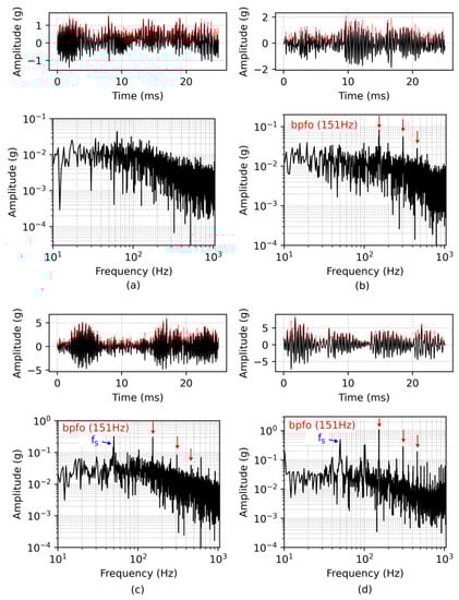 Result of envelope analysis (red dotted) from measurement and corresponding FFT. Subplot (a) shows the time domain and frequency domain of a healthy bearing. The vibration data and FFT of a faulty bearing with an outer ring defect size of 500 m, 900 m and 1200 m is depicted in (b–d), respectively. Here, the first three harmonics are indicated as red arrows. The shaft frequency, marked as (50 Hz) is prominent in (c,d).