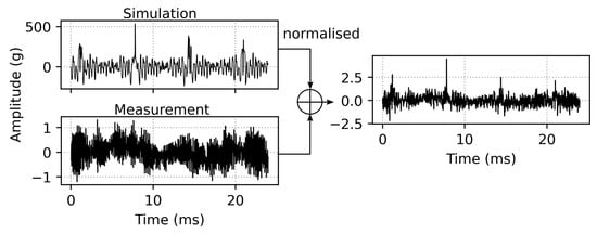 Data preprocessing steps, where the simulated time series is normalised and superimposed to the background noise obtained from the measurement of a healthy bearing.