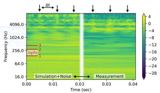 Figure 8 depicts the power spectral density (PSD) of simulation and measurement data after wavelet transform. Note, the simulation data consist of sharper pronounced peaks, which result in higher concentrated power at high frequencies. Further, the harmonics are more confined at the frequency level, compared to the broadened appearance of the frequency component of the measurement. The arrows on the top mark the occurring high frequency pattern when the balls overrun the outer ring defect. Here, ms corresponds with . The first three harmonics of are indicated as red lines on the left. Note that the frequency scale is set to the binary logarithm, to increase the visibility of the low frequency components.